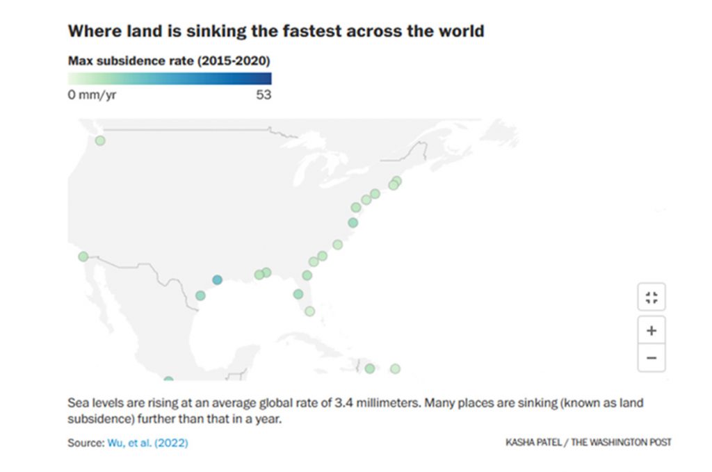 Such land subsidence can worsen damage during extreme weather events. Researchers found that the majority of areas flooded during 2017′s Hurricane Harvey showed relatively high subsidence rates.