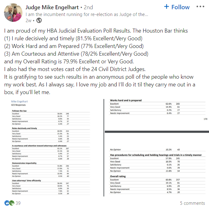 I have supported Judge Engelhart for as long as I have voted in the Democratic Primary. I have seen him often at the Southwest Democrats meetings several times since I have been a member. Judge Engelhart has been a judge since 2009.