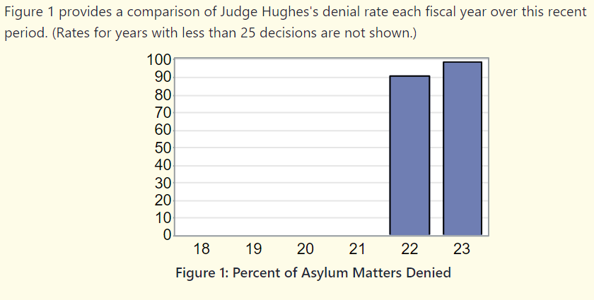 I did not find where Houston Lawyers rated Judge Hughes; it could be that she moved to immigration court a few years after she won the election for Criminal Court at Law 3. However, she did receive a report as an immigration judge. She had one of the highest numbers for denying asylum to persons.