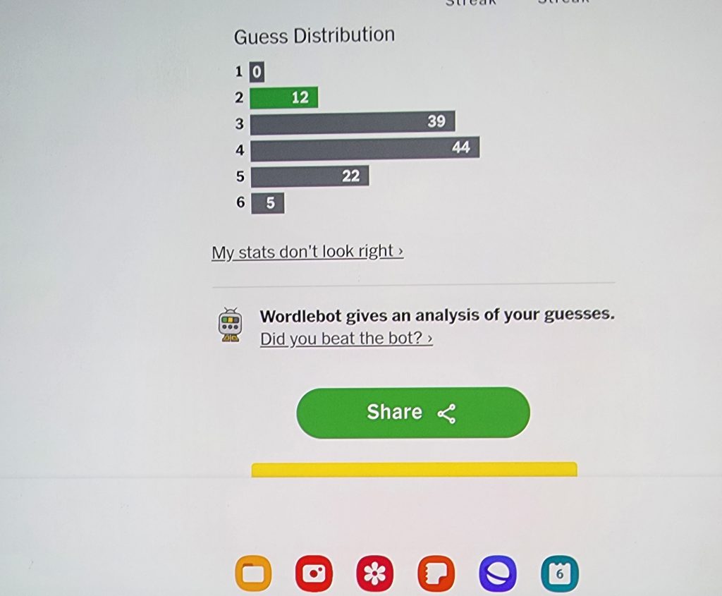 I recently renewed my subscription to the New York Times as I missed Wordle and my desire to beat the bot. Today was one such day, although I have been tying the bot recently. My second guess today was the correct word. But that is luck to a degree because, based on what the bot states, as I review my guesses, there is some pattern for how to guess. For instance, often enough, I guess a word, and the bot says that while it is a word, it is not a word that Wordle would have. Like I am supposed to know that.