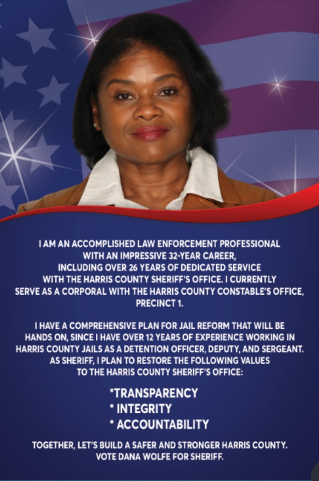 Dana Wolfe that people seem to be searching for is a candidate for Sheriff of Harris County. I have notice that numerous people had searched for Dana Wolfe, probably for the same reason that I had searched early last month and could not find anything about her, at least anything that I could state with certainty that it was her.