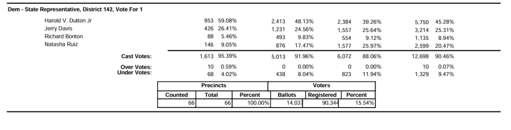 Dutton finished first holding 45 percent and Houston City Council Member Jerry Davis received 25 percent and made it into the runoff.