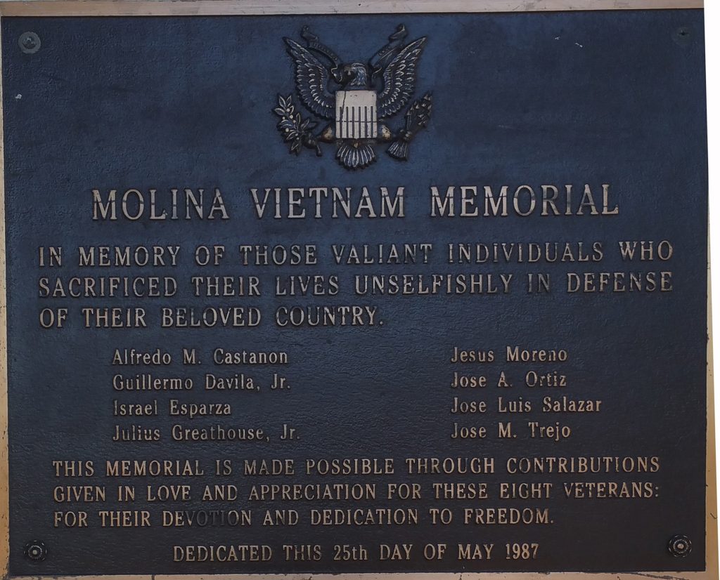 Today is Memorial Day. Below is an image of a Vietnam Memorial in Molina, a Corpus Christi, Texas neighborhood. Eight young men gave their lives for this country during the Vietnam conflict. I knew seven of them; two were best friends, boys I grew up with and hung around with.