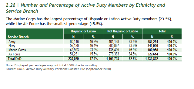 Many of our young men and some women believe in service to our country and proving how tough one is, thus the reason that about 25% of Hispanics choose to join the Marines. About 20% join the military. That is a higher percentage of young men and women eligible to join.