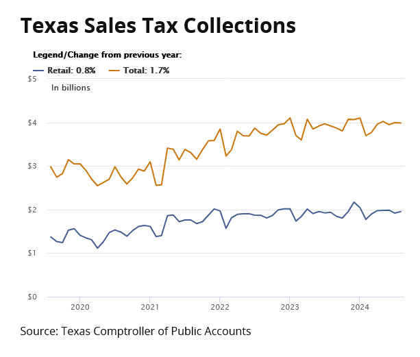 Texas Sales tax revenue up by 54% over the last four years.