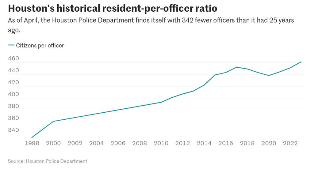 Below is a chart that indicates how the number of police officers per Houston resident has increased over the last 25 years.