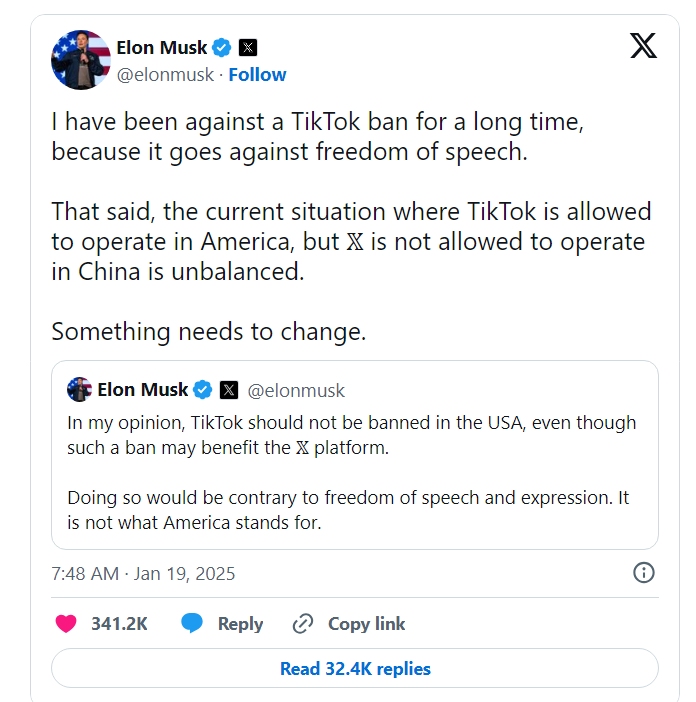 Musk, who is close to Trump, says that he disagreed with the TikTok ban would like to see China unban Twitter/X from their country.