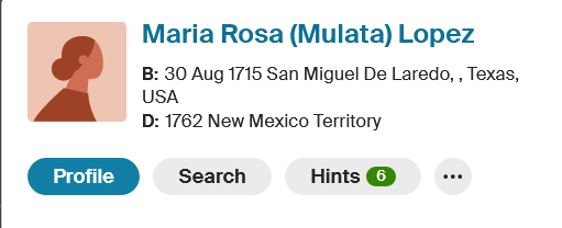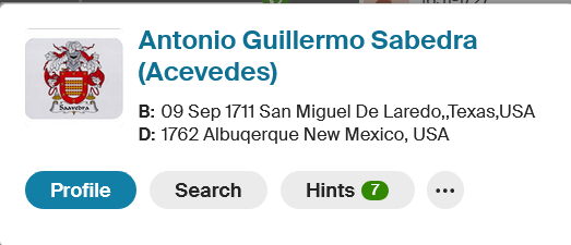 The image in the top-left corner shows the name, birth, and death of the Seventh Great-Grandfather on my mother’s side of the family. Born in 1711 in Laredo, Texas, USA, and died in 1762 in Albuquerque, New Mexico, USA. The history goes much further back to the early 1600s. That would be my European ancestors.