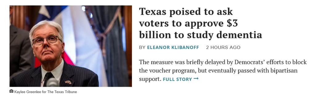 During COVID, Lt. Governor Dan Patrick asked us old folks to sacrifice ourselves to keep the economy going. Now he wants to spend billions of our dollars to try to keep our brains functioning for longer. As a Republican once said about a Democrat, it is easy to spend other people’s money.