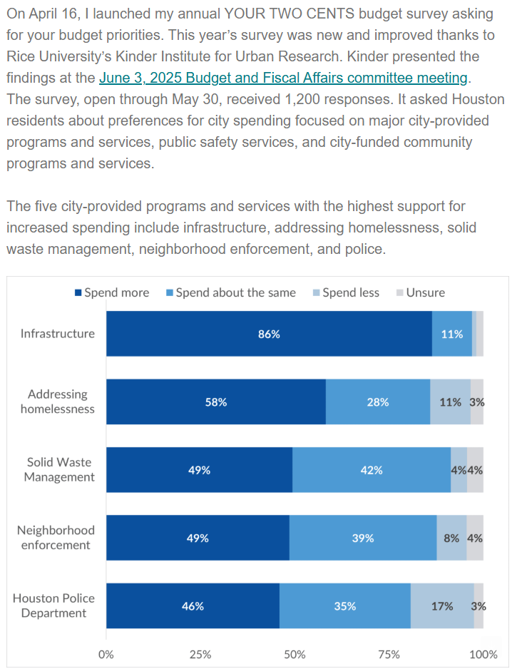 The Kinder Institute at Rice recently heard from 1,200 Houstonians. The survey comes after Mayor John Whitmire released his proposed budget.