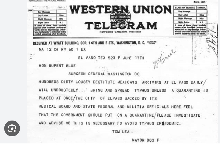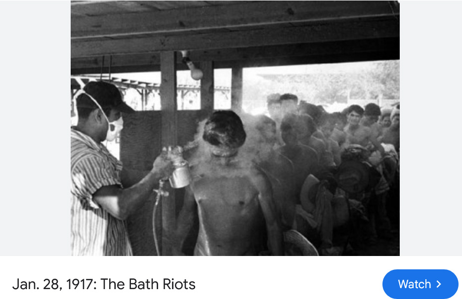 Around 1920, every Mexican border crosser had to be “deloused.” They were required to take all their clothes off and stand naked before a customs inspector who would check their “hairy parts.”, including the private parts. If they found lice on all their hair, including in the private parts, it was shaved.