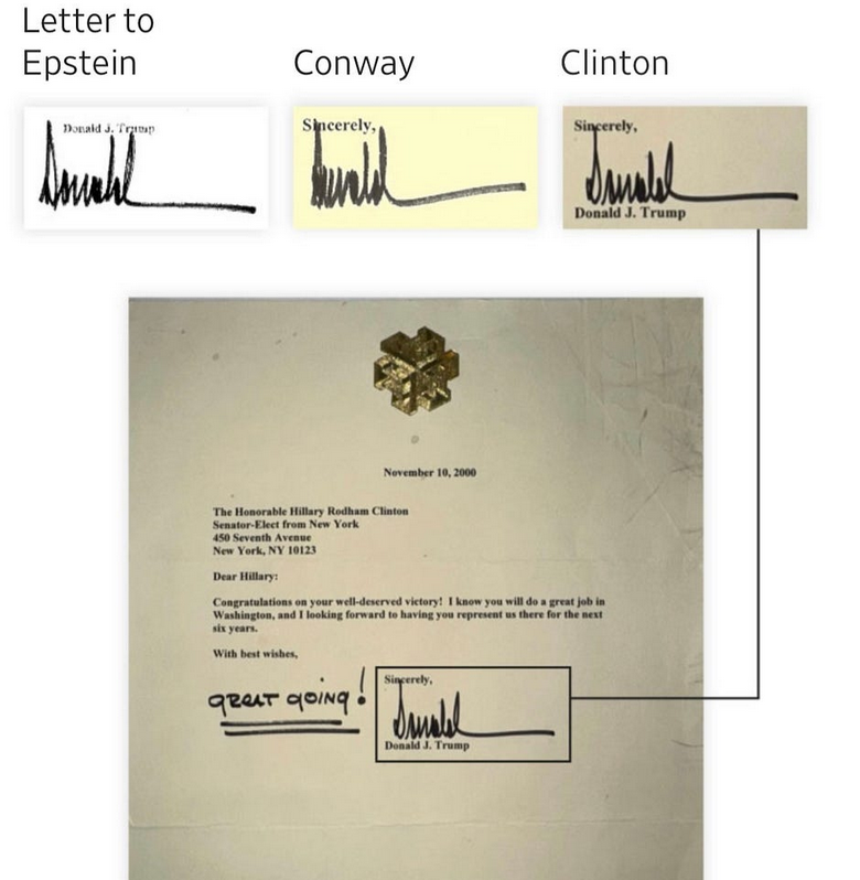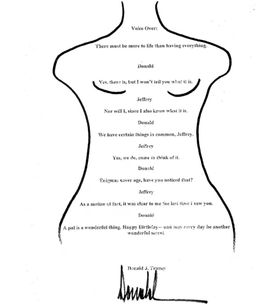 Now, thanks to the Democrats on the House Oversight Committee, we have seen the note. We know it’s real. We know it’s his signature (WSJ link here). And we know he signed a birthday greeting to a notorious pedophile — “may every day be another wonderful secret.”