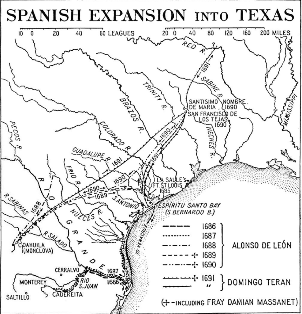 He was involved in establishing San Francisco de los Tejas in 1690, the first Spanish mission in East Texas. In doing so, he blazed the trail for much of the Old San Antonio Road. During his expeditions, he named several Texas rivers, including the San Marcos River, the Guadalupe, the Medina, the Nueces, and the Trinity.