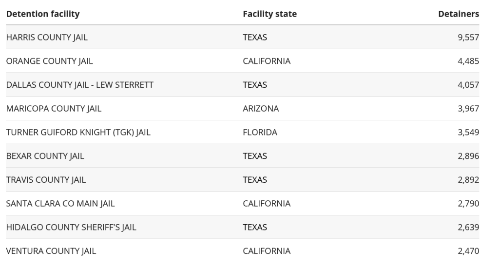 “ICE agents visit Harris County jail almost daily and can access jail records to conduct their own immigration checks, said Jason Spencer, the agency’s chief of staff. The jail honors ICE’s request to hold inmates suspected of being in the country illegally, Spencer said.” Source