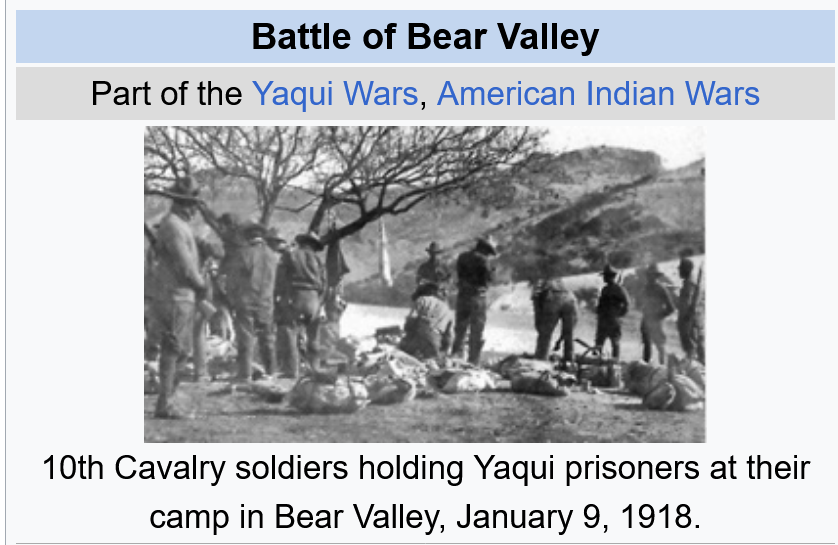 The Battle of Bear Valley was a small engagement fought in 1918 between a band of Yaquis and a detachment of United States Army soldiers. On January 9, 1918, elements of the American 10th Cavalry Regiment of Buffalo Soldiers detected about thirty armed Yaquis in Bear Valley, west of Nogales, Arizona, a large area that was commonly used as a passage across the international border with Mexico. A short firefight ensued, which resulted in the death of the Yaqui commander and the capture of nine others. Though the conflict was merely a skirmish, it was the last time the United States Army and Native Americans engaged in combat and thus has been seen as the final official battle of the American Indian Wars.