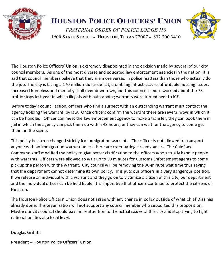 Below is the full letter issued by the Houston Police Union. Notice the threat to Council Members who supported the measure.